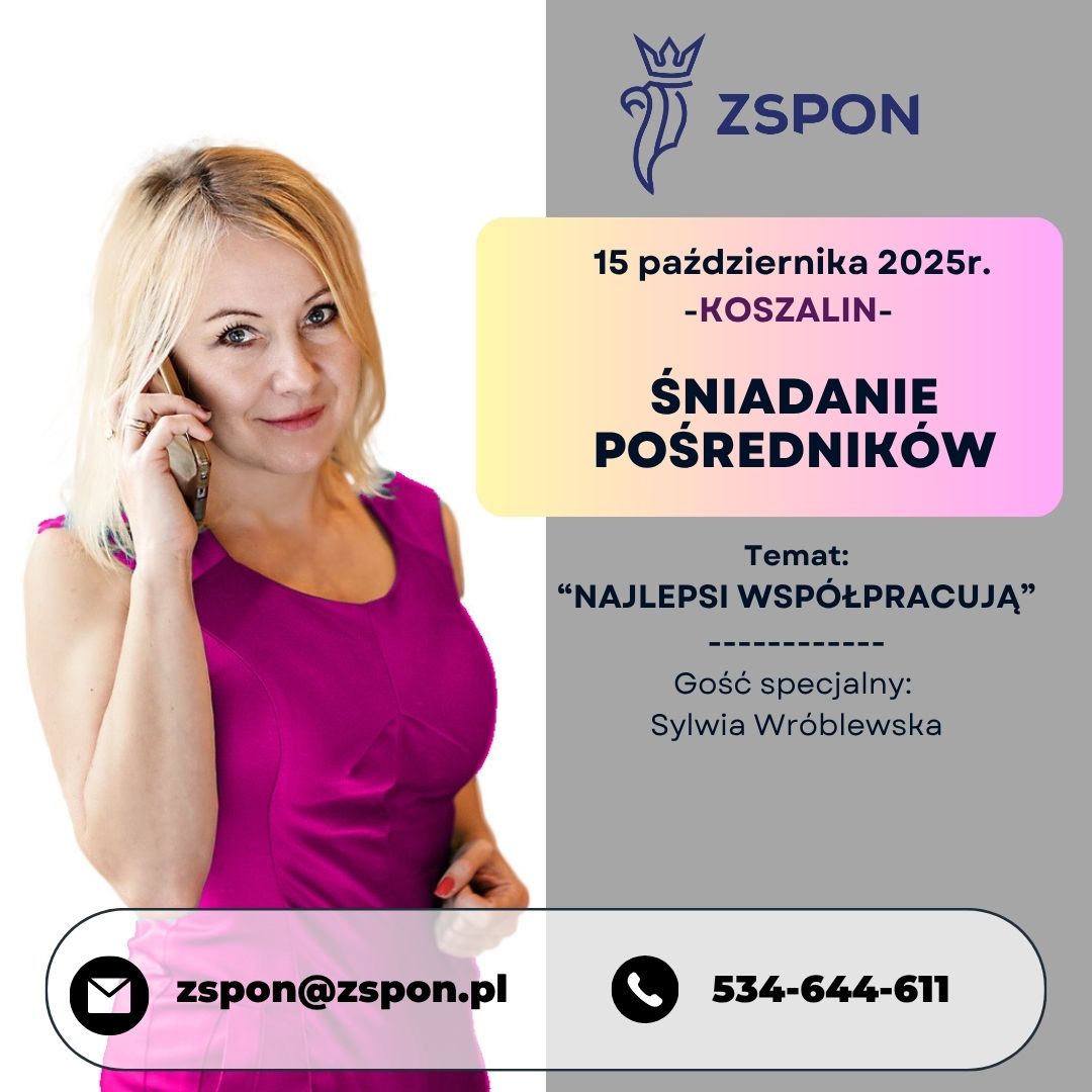 Zapraszamy na ŚNIADANIE POŚREDNIKÓW W KOSZALINIE… Termin:  15 października 2025r. (środa) Godziny: 10:00-12:00 Miejsce: Restauracja Teatralna – Koszalin, ul. Marii Skłodowskiej-Curie 1 ———————————————– TEMAT: “NAJLEPSI WSPÓŁPRACUJĄ” GOŚĆ SPECJALNY: SYLWIA WRÓBLEWSKA ———————————————– Uczestnicy: Członkowie ZSPON, pracownicy oraz współpracownicy Członków Wstęp: członkowie ZSPON oraz ich pracownicy 95zł; pozostałe osoby 110zł – płatność przelewem na konto ZSPON przed śniadaniem Zgłoszenia do udziału w Śniadaniu prosimy przesyłać mailowo zspon@zspon.pl lub telefonicznie […]