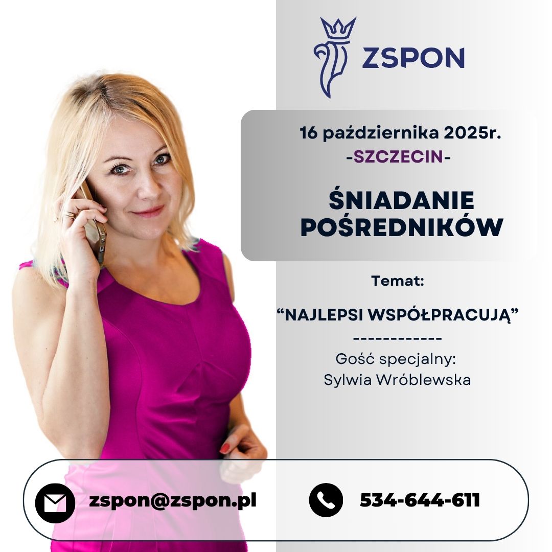 Zapraszamy na pierwsze po wakacjach ŚNIADANIE POŚREDNIKÓW W SZCZECINIE… ŚNIADANIE POŚREDNIKÓW W SZCZECINIE Termin:  16 października 2025r. (czwartek) Godziny: 10:00-12:00 Miejsce: Grand Park Hotel – Restauracja SI – Szczecin ul. Słowackiego 18 ———————————————– TEMAT: “NAJLEPSI WSPÓŁPRACUJĄ” GOŚĆ SPECJALNY: SYLWIA WRÓBLEWSKA ———————————————– Uczestnicy: Członkowie ZSPON, pracownicy oraz współpracownicy Członków, osoby niestowarzyszone Wstęp: członkowie ZSPON – 90zł; pracownicy oraz pozostałe osoby 100zł – płatność przelewem na konto ZSPON przed śniadaniem Zgłoszenia do […]