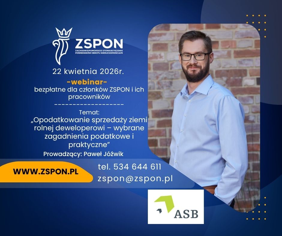 Zachodniopomorskie Stowarzyszenie Pośredników Obrotu Nieruchomościami (ZSPON) zaprasza na bezpłatny webinar „Opodatkowanie sprzedaży ziemi rolnej deweloperowi – wybrane zagadnienia podatkowe i praktyczne”. Już 22 kwietnia, o godzinie 10:00 podczas spotkania zorganizowanego dla ZSPON, kompleksowo przedstawione zostaną najważniejsze elementy transakcji sprzedaży gruntu rolnego. Webinar poprowadzi Paweł Jóźwik, doradca podatkowy i radca prawny, starszy menedżer w zespole doradztwa podatkowego w firmie doradczej ASB Group.
